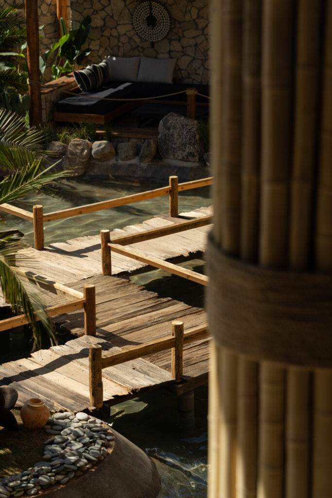 The wooden bridge pathways also link distinctive lounging areas and stylish dining terraces, shaded by handcrafted parasols that lend a soft, sun-dappled romance that feels more coastal retreat than mountain town. These intimate vignettes, together with other thoughtfully crafted areas such as the snow mountain viewing deck and waterside booth seating, invite guests to linger longer. The layout breaks away from the traditional courtyard’s inward-facing seclusion, allowing the restaurant to operate flexibly throughout the day. It could transition from an open-air market by day, to an alluring social lounge by dusk, and finally an intimate retreat by night.