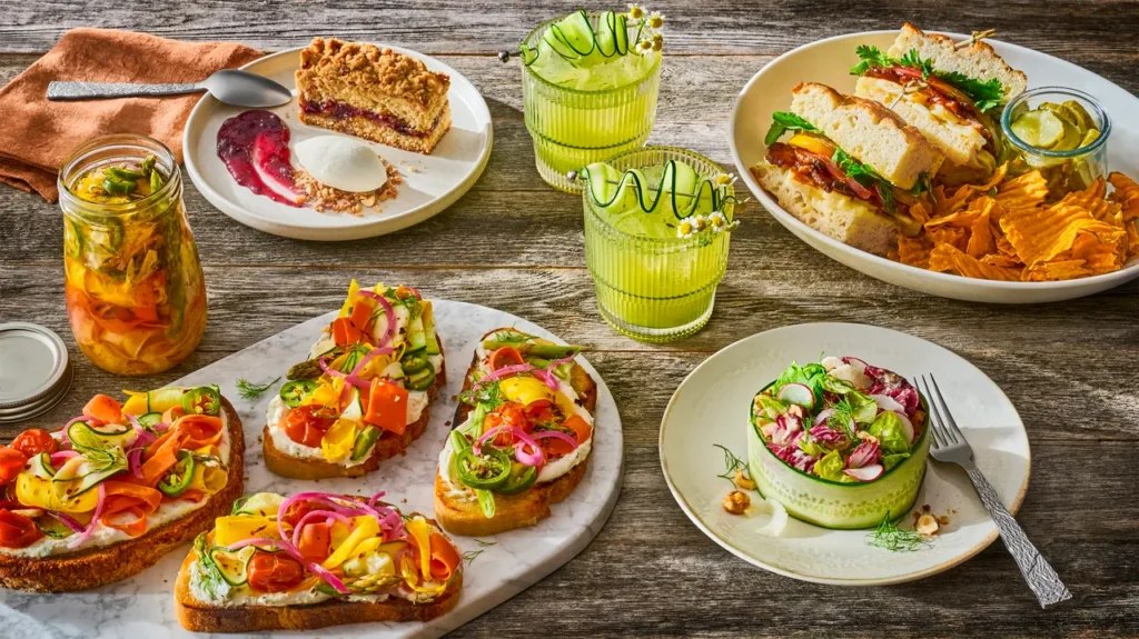 This trend is certainly about simplicity but also getting back to basics and keeping things easy, healthy, satisfying and local. Pickled veggie toast features herbed ricotta and a mix of quick-pickled carrots and tomato confit on crusty sourdough, while refreshing green apple agua frescas are a great N/A option with fruit and veggies (we love the unexpected addition of romaine) and herby notes from dill and fennel seed all mixed with club soda and topped with fresh dill, sliced apples, or even edible flowers. In the sandwich realm, a classic BLT gets gussied up with herbed focaccia, halloumi, and candied bacon, and a classic PB and J is giving coffee cake with layers of black currant jelly and peanut streusel and a scoop of vanilla on the side. We love a winter salad and this version with maple-mustard cashew vinaigrette might be the prettiest we’ve seen. Fennel-candied hazelnuts add pops of crunch on top and a slice of cucumber wrapped around the bright and fresh mix and holds it all together.